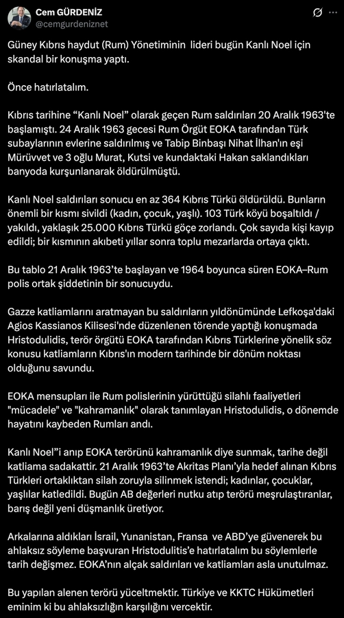Paylaşımında Rum Yönetimi’nin İsrail, Yunanistan, Fransa ve ABD gibi ülkelerin desteğine güvenerek bu tür söylemlere başvurduğunu ifade eden Cem Gürdeniz, “Bu söylemlerle tarih değişmez. EOKA’nın alçak saldırıları ve katliamları asla unutulmaz” dedi.