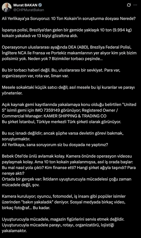 Son dönemde kamuoyuna yansıyan uyuşturucu operasyonlarını da hatırlatan Murat Bakan, üst düzey uluslararası dosyalara yeterli ilgi gösterilmediğini savunarak şu soruları yöneltti: