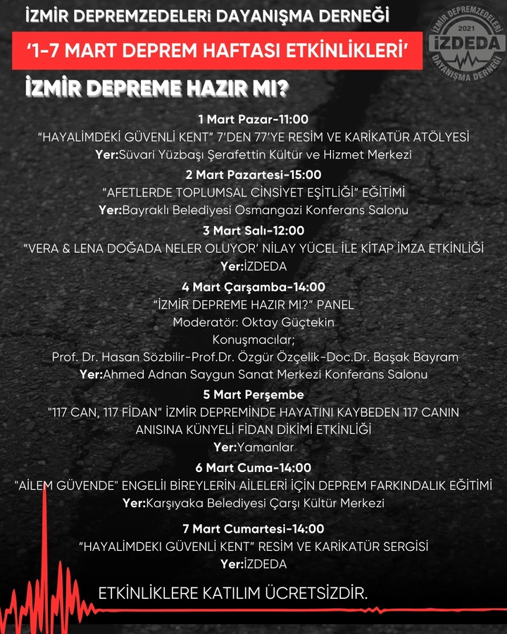 İzmir Depremzedeleri Dayanışma Derneği (İZDEDA), 30 Ekim 2020’de yaşanan yıkıcı depremin ardından deprem bilincini artırmak amacıyla çalışmalarına hız verdi. Dernek, 1–7 Mart Deprem Haftası dolayısıyla “İzmir Depreme Hazır mı?” başlığıyla bir dizi etkinlik düzenleme kararı aldı.