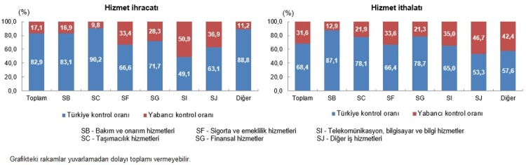 Hizmet ihracatının yüzde 17,1'i, ithalatının ise yüzde 31,6'sı yabancı kontrollü girişimler tarafından yapıldı. Taşımacılıkta ihracatın yüzde 90,2'si, ithalatın yüzde 78,1'i Türkiye kontrollü girişimlerin elinde. Telekomünikasyon, bilgisayar ve bilgi hizmetlerinde ise yabancı kontrollü girişimler ihracatta yüzde 50,9 pay ile öne çıktı.