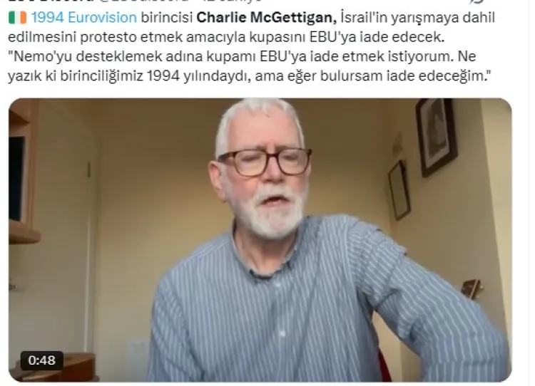 İrlandalı şarkıcı Charlie McGettigan, İsrail'in 2026 Eurovision Şarkı Yarışması'na katılmasına izin verilmesine tepki olarak 1994'te kazandığı ödülünü iade edeceğini açıkladı.