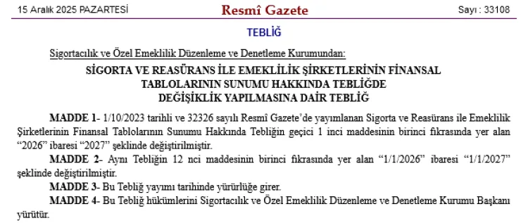 Sigortacılık ve Özel Emeklilik Düzenleme ve Denetleme Kurumu (SEDDK), finansal raporlama, tablo sunumu ve tekdüzen hesap planı tebliğlerinde değişiklik yaptı. 15 Aralık 2025 tarihli Resmi Gazete'de yayımlanan düzenlemelerle, yeni kuralların uygulanması 1 Ocak 2027'ye ertelendi.