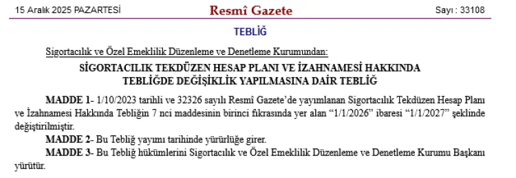 Sigortacılık Tekdüzen Hesap Planı Tebliği'ndeki değişiklik ise, 2023 tarihli tebliğin 7. maddesindeki "1/1/2026" ibaresi "1/1/2027"ye güncellendi.