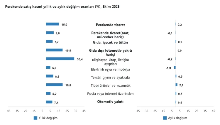 TÜİK'in açıkladığı ekim ayı verilerine göre, ticaret satış hacmi yıllık yüzde 7,4, perakende satış hacmi yıllık yüzde 15 arttı.