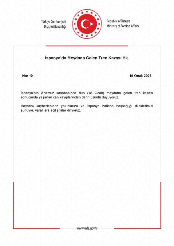 Dışişleri Bakanlığı, Adamuz kasabasında 18 Ocak'ta meydana gelen tren kazasında yaşanan can kayıpları nedeniyle derin üzüntü duyulduğunu açıkladı.