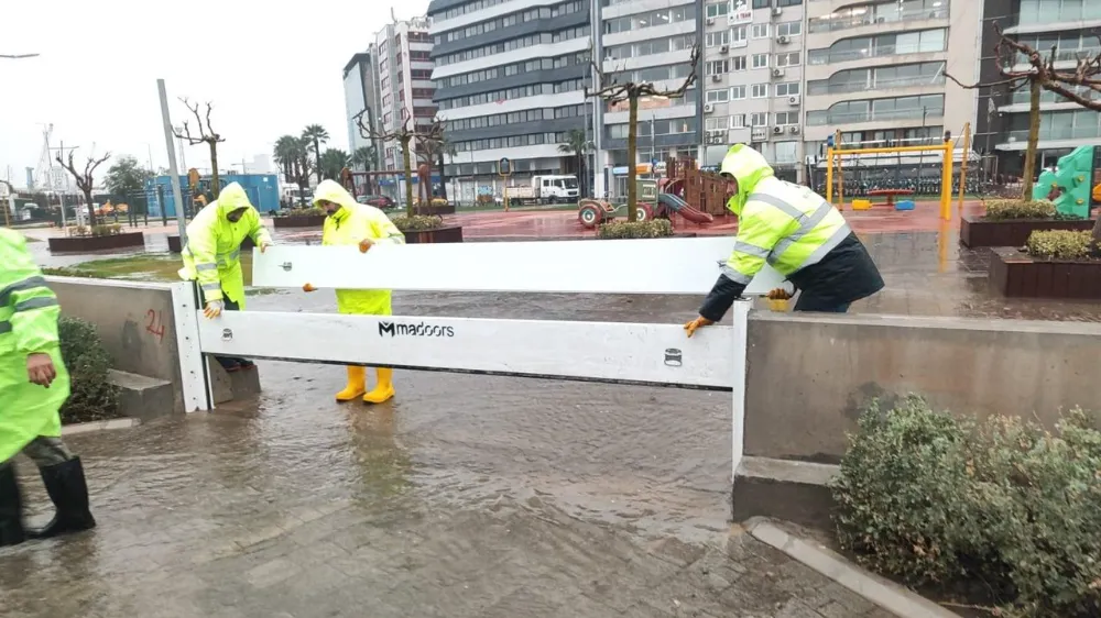 Mart 2025’te, Alsancak Limanı ile Cumhuriyet Meydanı arasında kalan 1.700 metrelik sahil şeridinde geçici fırtına duvarı ve sel kapıları tamamlandı.